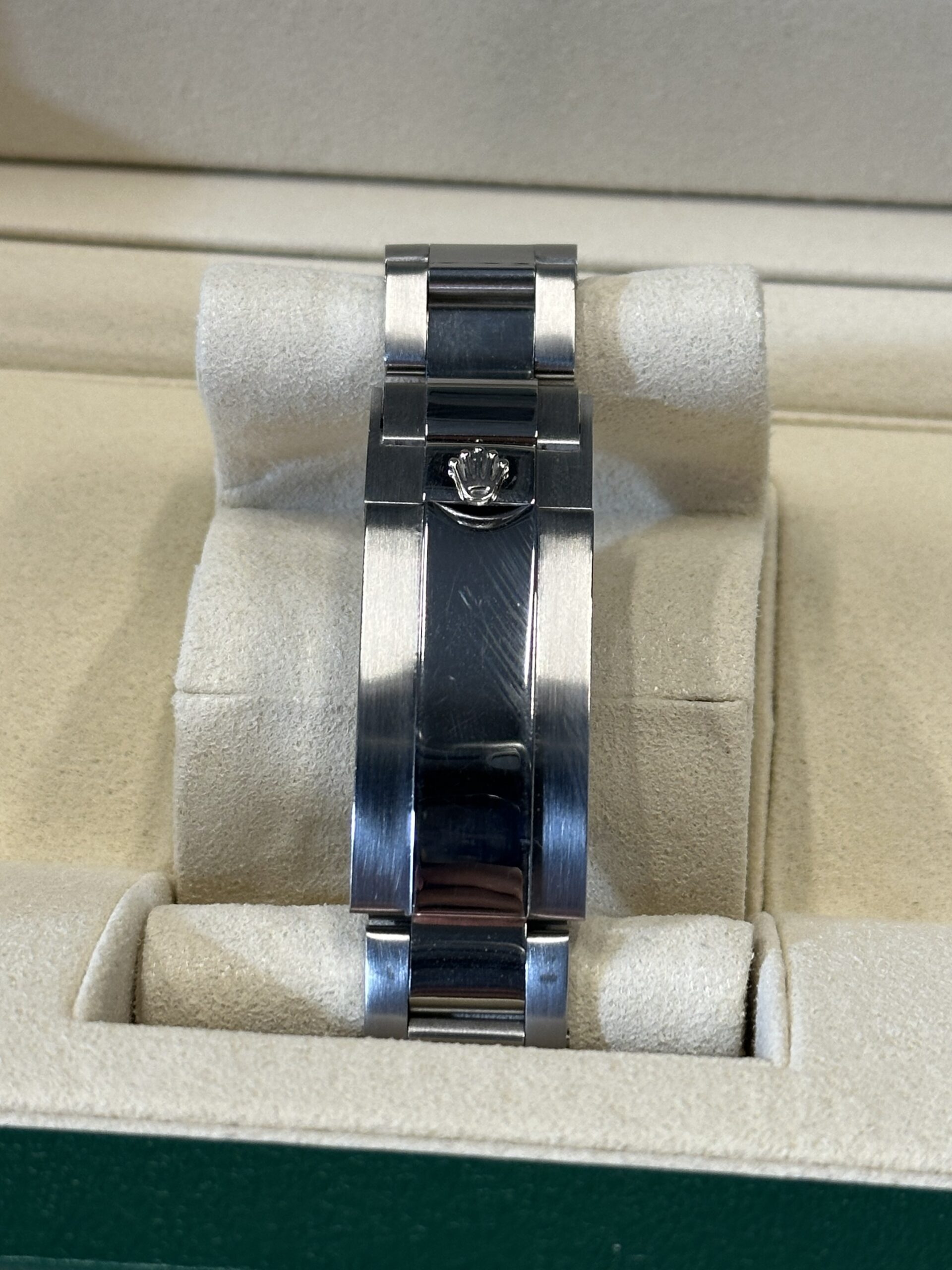 Deze Rolex GMT-Master II 40” in AAA+ kwaliteit met de iconische Batman bezel is in bijna nieuwstaat. Het horloge is slechts één keer gebruikt en verkeert in een 9.5/10 staat: bijna geen zichtbare gebruikssporen en volledig functioneel. Het is een uitstekende keuze voor wie een bijna nieuw model zoekt met de iconische blauwe en zwarte bezel.